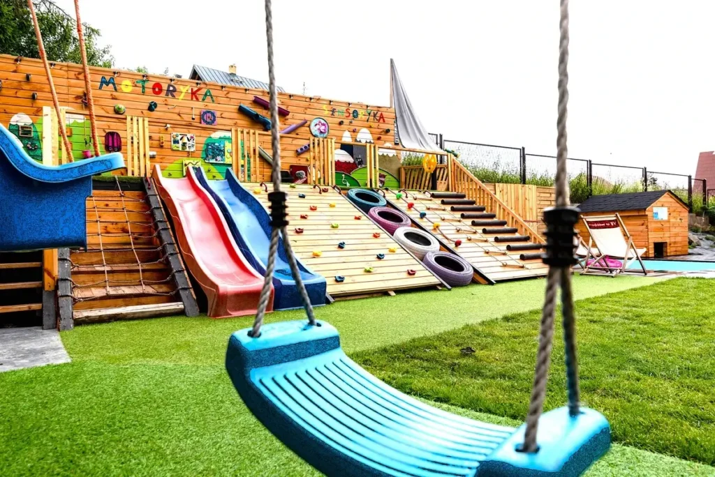 Plac zabaw wyposażony jest w: ścianki wspinaczkowe, zjeżdżalnie, domek, ścianki manipulacyjne (sensoryczna, rytmiczna i motoryczna), piaskownicę, trampolinę, huśtawki i miejsca do odpoczynku.